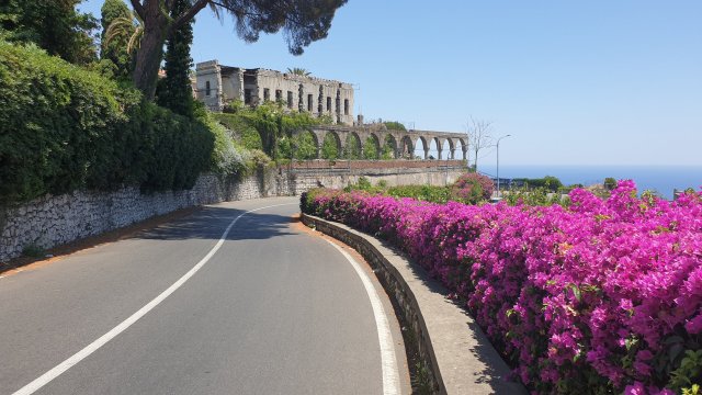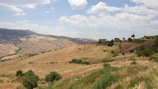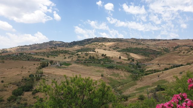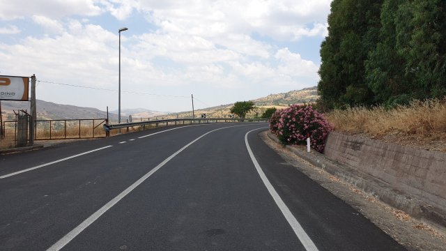 Per scendere giù nel caldo e arido entroterra siculo avevo pianificato tre strade: quella diretta, ma meno sicura di 22 km, una lunga e più battuta di 37 km e una intermedia di 33 km con però molto più dislivello. Opto per seguire quella da 37 km, ma dopo pochi minuti, seguendo la strada che sembrava essere stata asfaltata ieri sera quanto era perfetta, mi trovo sulla variante corta. Continuo a seguirla perché era troppo bella e dalle scritte per terra mi rendo conto che qui c’era passato il giro d’Italia.