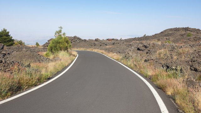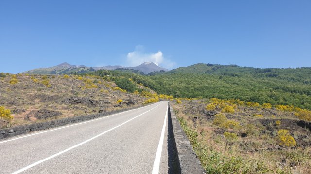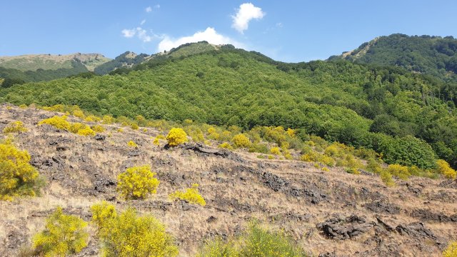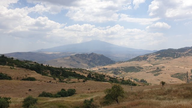 Il paesaggio che mi circonda è spettacolare, sembra di essere su un altro pianeta. Da un lato tutto giallo quasi privo di alberi, dall’altro si intravedono in lontananza grandissime aree verdi, boschi foltissimi, ed è proprio lì che mi sto dirigendo, verso il Parco dei Nebrodi. Poi, immancabile, è la vista sull’Etna onnipresente, col suo pennacchio che mostra la sua attuale attività vulcanica.