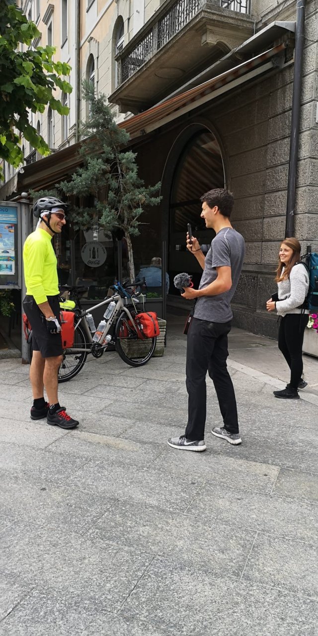 Proprio prima di mettermi in viaggio vengo approcciato da un tizio che in inglese mi chiede se poteva farmi un’intervista video sull’uso delle borse da viaggio della Ortlieb, una marca tedesca che produce borse e zaini per attività outdoor, e i miei borsoni attaccati alla bici sono di quella marca. Lui è olandese ed accompagnato da una ragazza spagnola, lavorano per la Ortlieb e girano l’Europa alla ricerca di testimonianze vere sull’uso del materiale della Ortlieb, testimonianze che filmano e che poi mettono su Instagram come messaggio promozionale. Divertito dalla cosa accetto, firmo una liberatoria, e mi faccio riprendere con il ragazzo mi intervista.