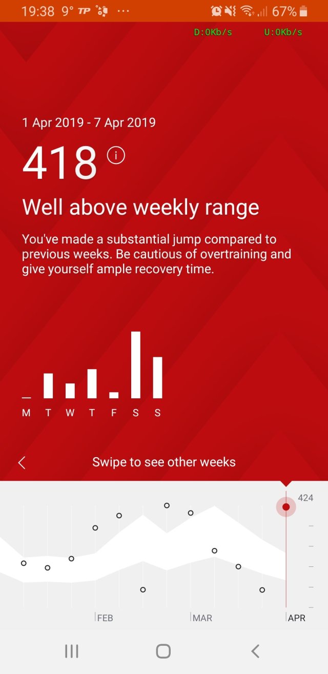 Nella foto sotto viene riportato il parametro di Strava “Sforzo Relativo” che per questa settimana appena passata è 418. Dal confronto con le settimane passate si vede che sto ritornando ai livelli di prima.