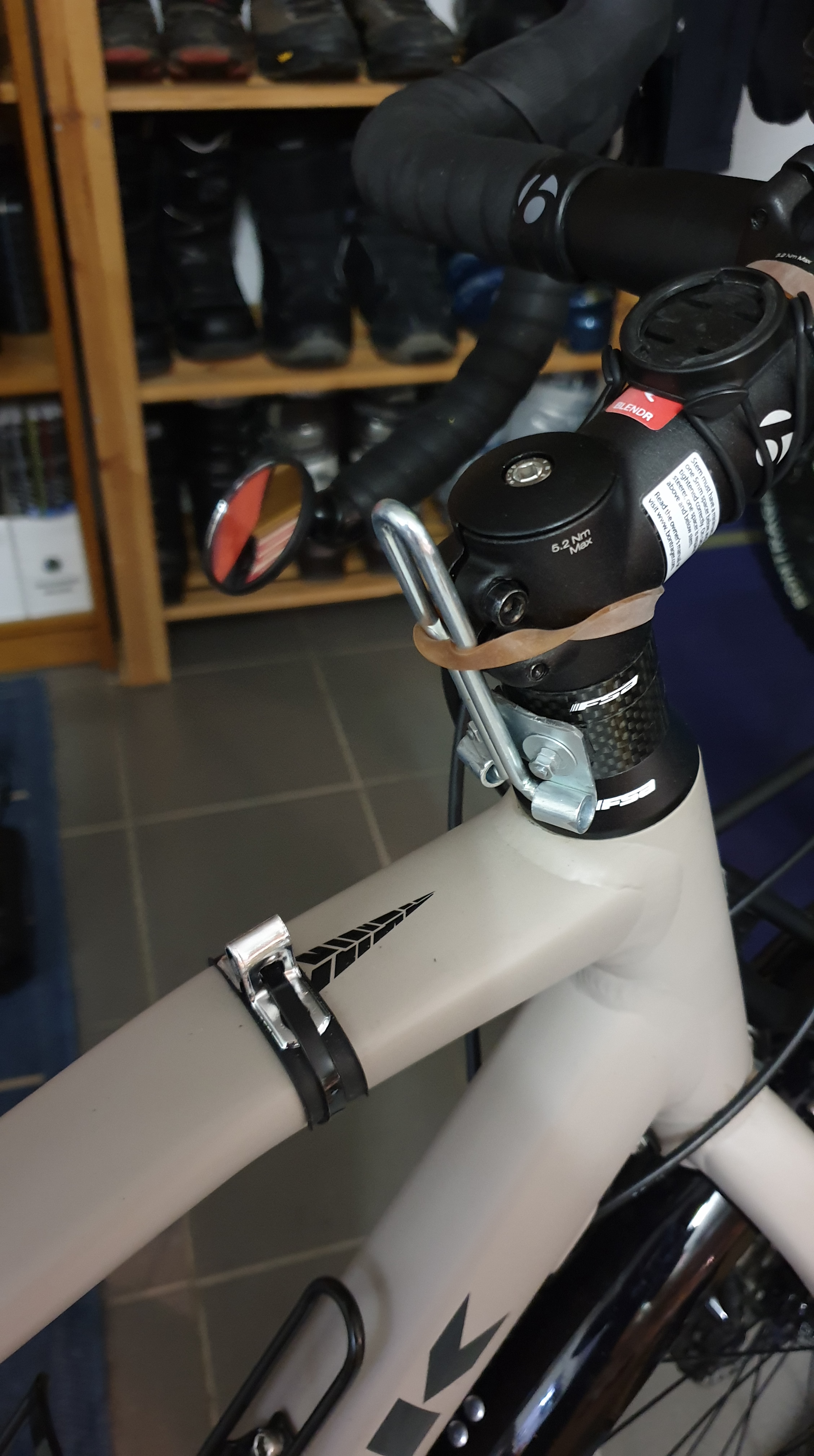 Rispetto alla versione spoglia visibile nella prima foto, oltre ai pedali, ho aggiunto diverse altre componenti alla mia bicicletta. Tra queste, sono presenti i parafanghi, un cavalletto robusto e molte altre aggiunte come luci, un porta GPS e un allarme di movimento. In particolare, ho creato personalmente un blocca-manubrio che serve a prevenire la rotazione involontaria dell’asse di sterzo quando la bici è parcheggiata sul cavalletto e sono presenti borse sul portapacchi anteriore. Senza questo blocco, il peso delle borse farebbe immediatamente ruotare il manubrio, rendendo instabile la bici sul cavalletto e rendendo anche scomodo l’accesso alle borse.
