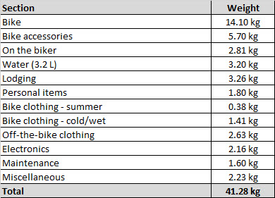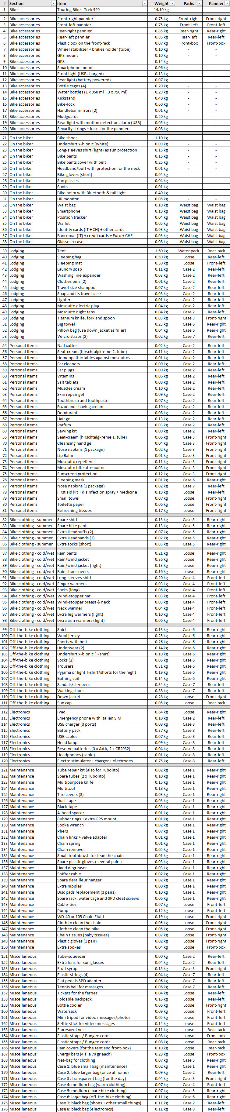 Nella sezione “Bike accessories” sono incluse le 4 borse laterali con un peso totale di 3.2 kg (vuote). Alla fine della lista dettagliata, ho anche riportato la distribuzione dei pesi nelle borse e nei contenitori. È una buona idea avere una copia stampata di tutta questa lista, in modo da poter fare riferimento facilmente a dove sono collocati tutti gli oggetti. Ciò aiuterà a trovare ciò che uno cerca senza difficoltà durante il viaggio.